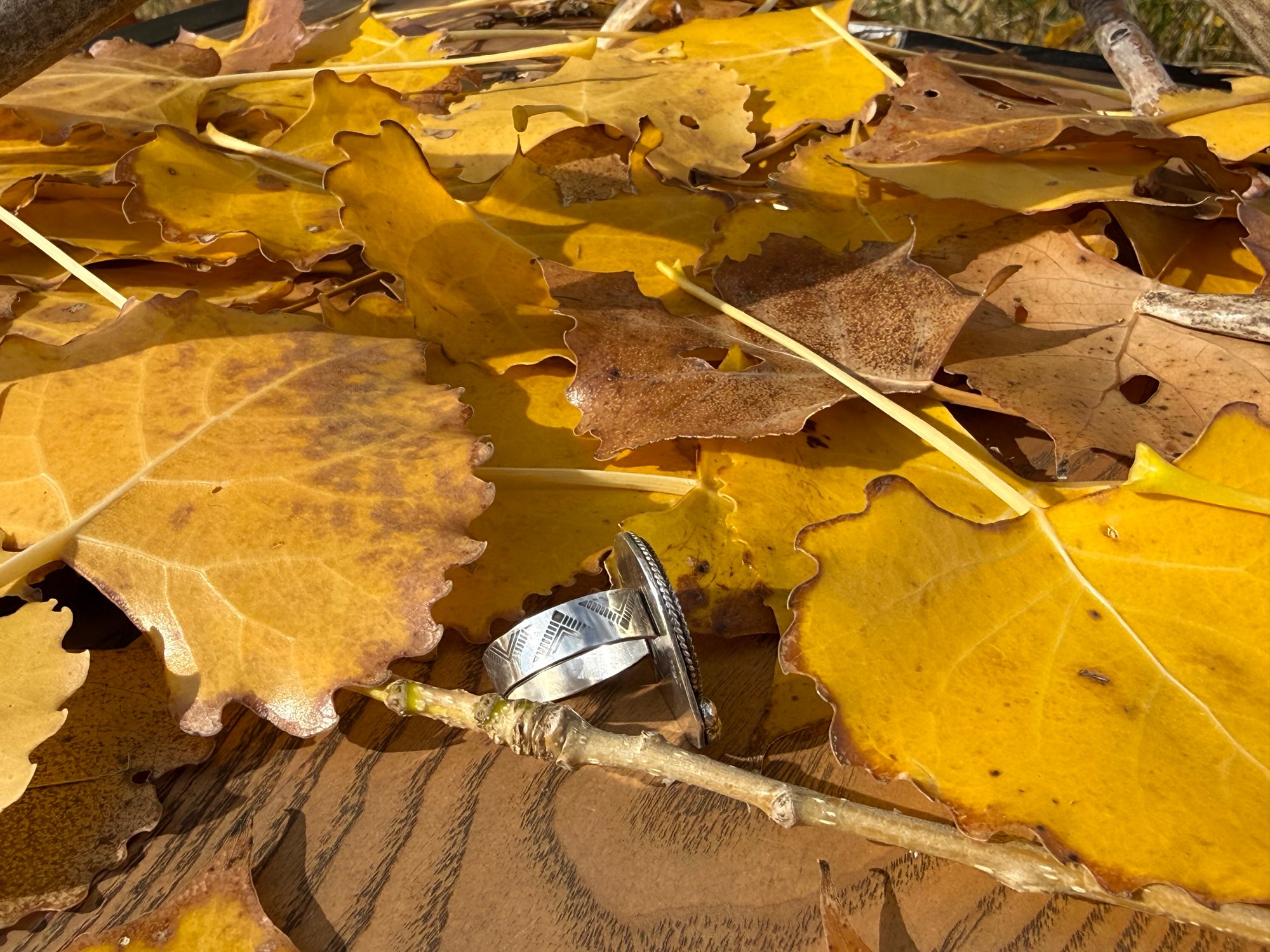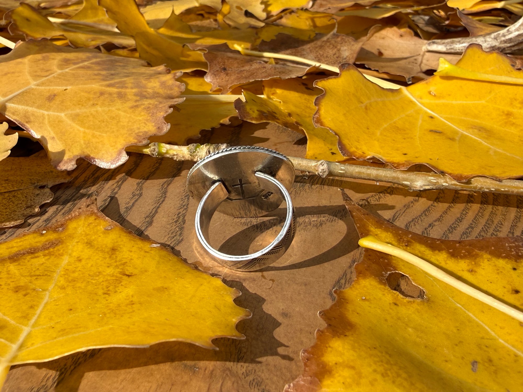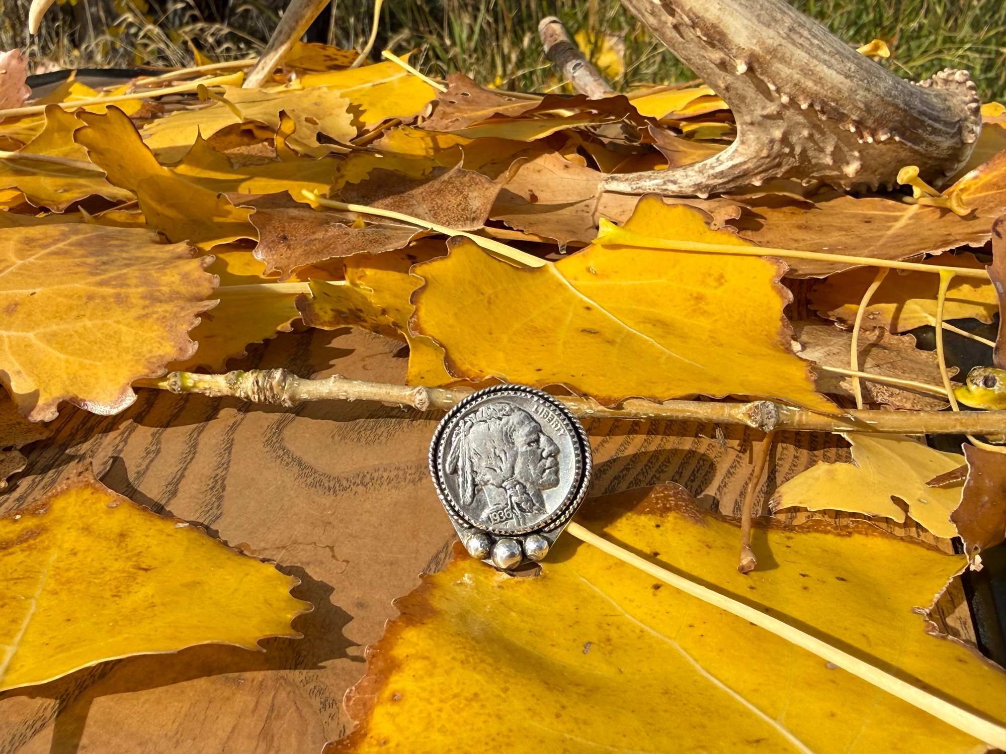 Indian Head Nickel Ring. Sterling silver ring with nickel set in silver. Hand stamped band. Makers mark on the back.