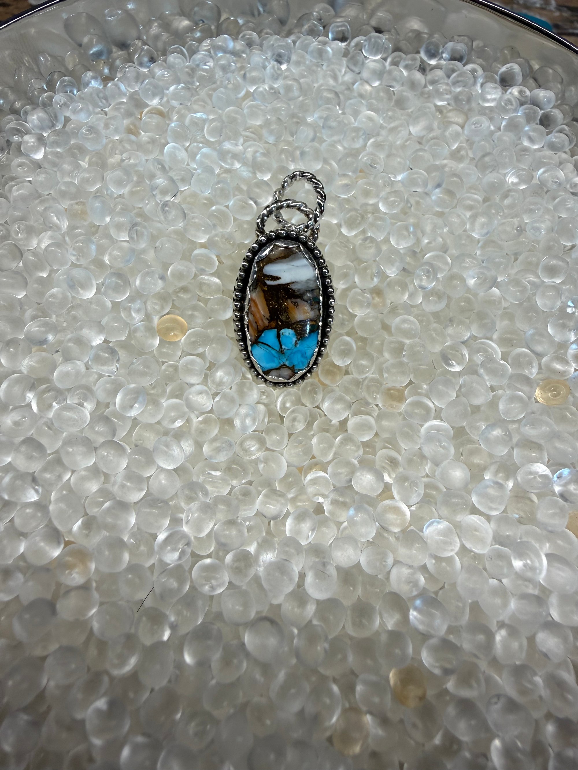 Handmade in sterling silver, this pendant features a stunning Oyster Shell Copper Turquoise cabochon - a natural collage of sky blue turquoise, warm copper, creamy whites, and earthy browns. It looks like the Southwest captured in a single stone… desert sand meeting bright blue sky, all stitched together with fire and time.