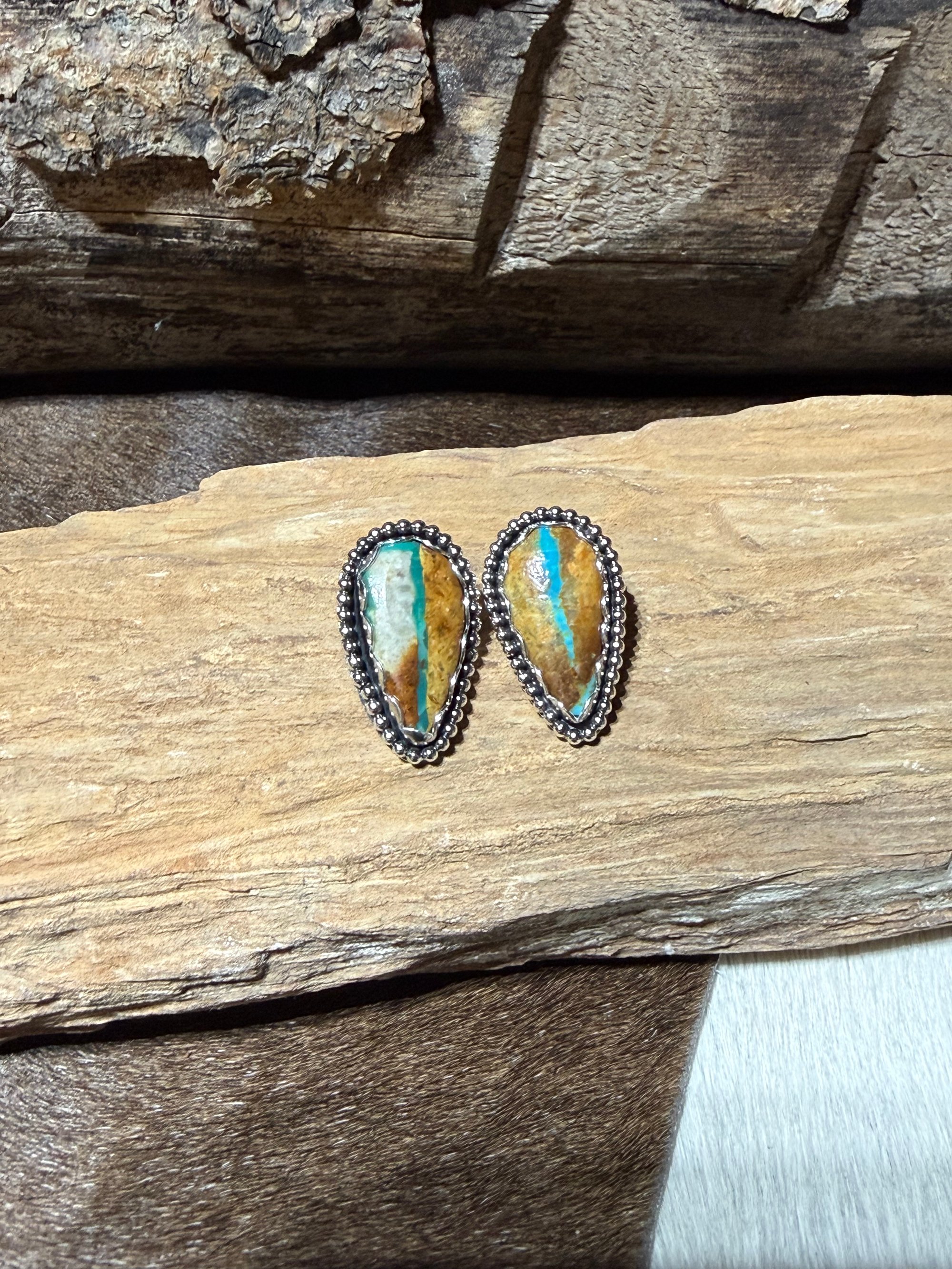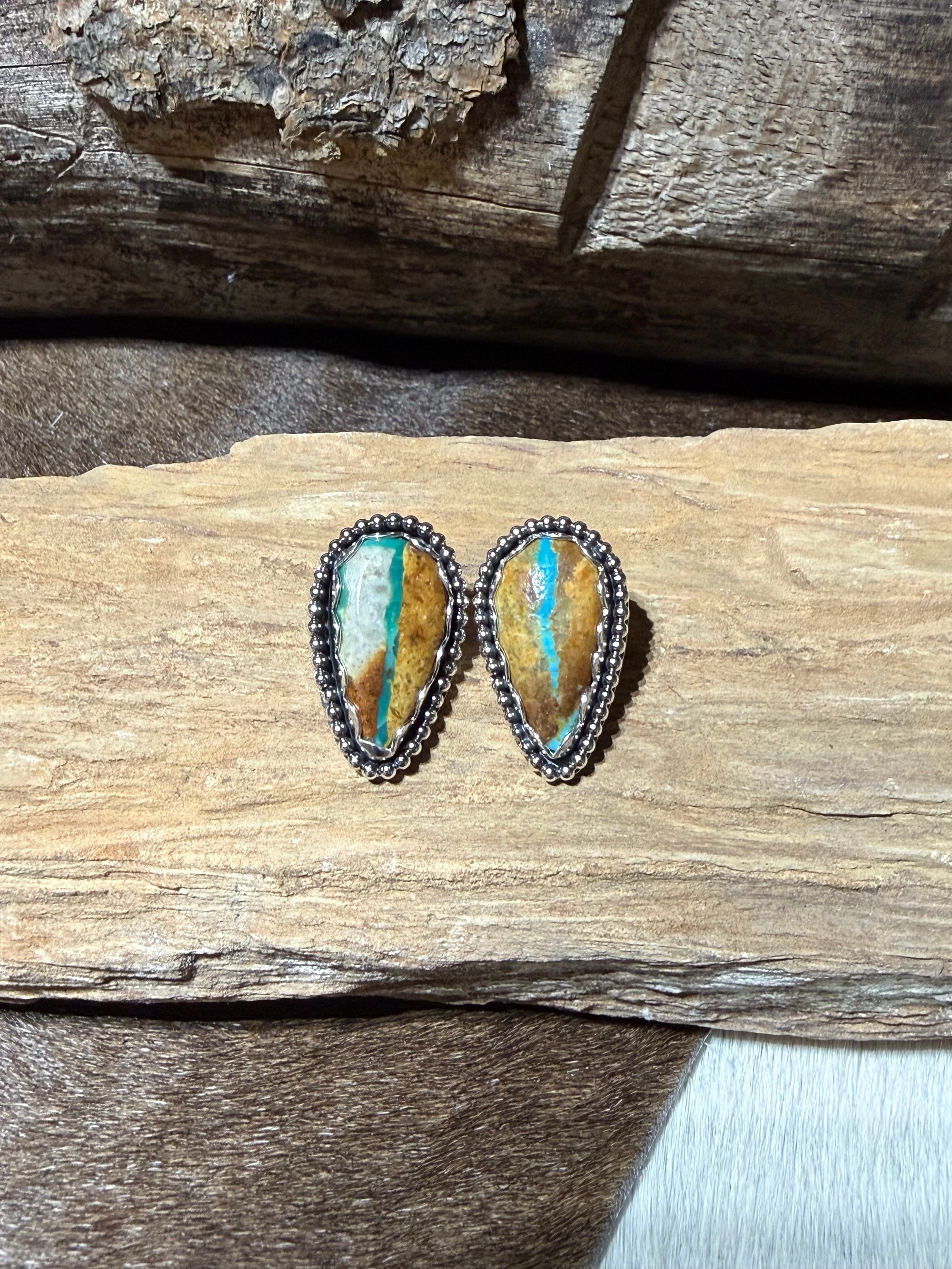Royston Ribbon Turquoise stud earrings set in sterling silver with a beaded border. Each pair features natural ribbon matrix and vibrant blue tones, making no two exactly alike.