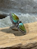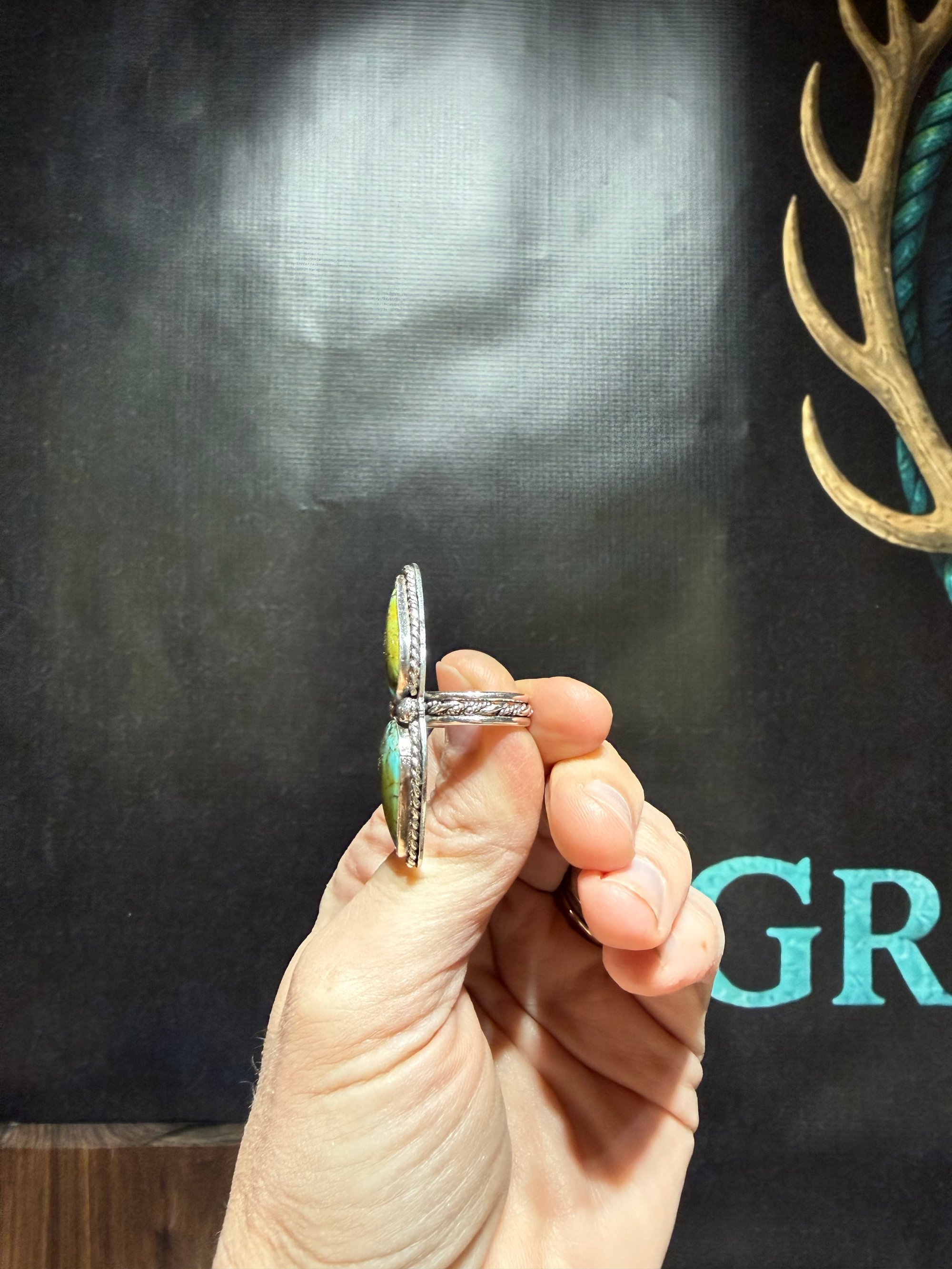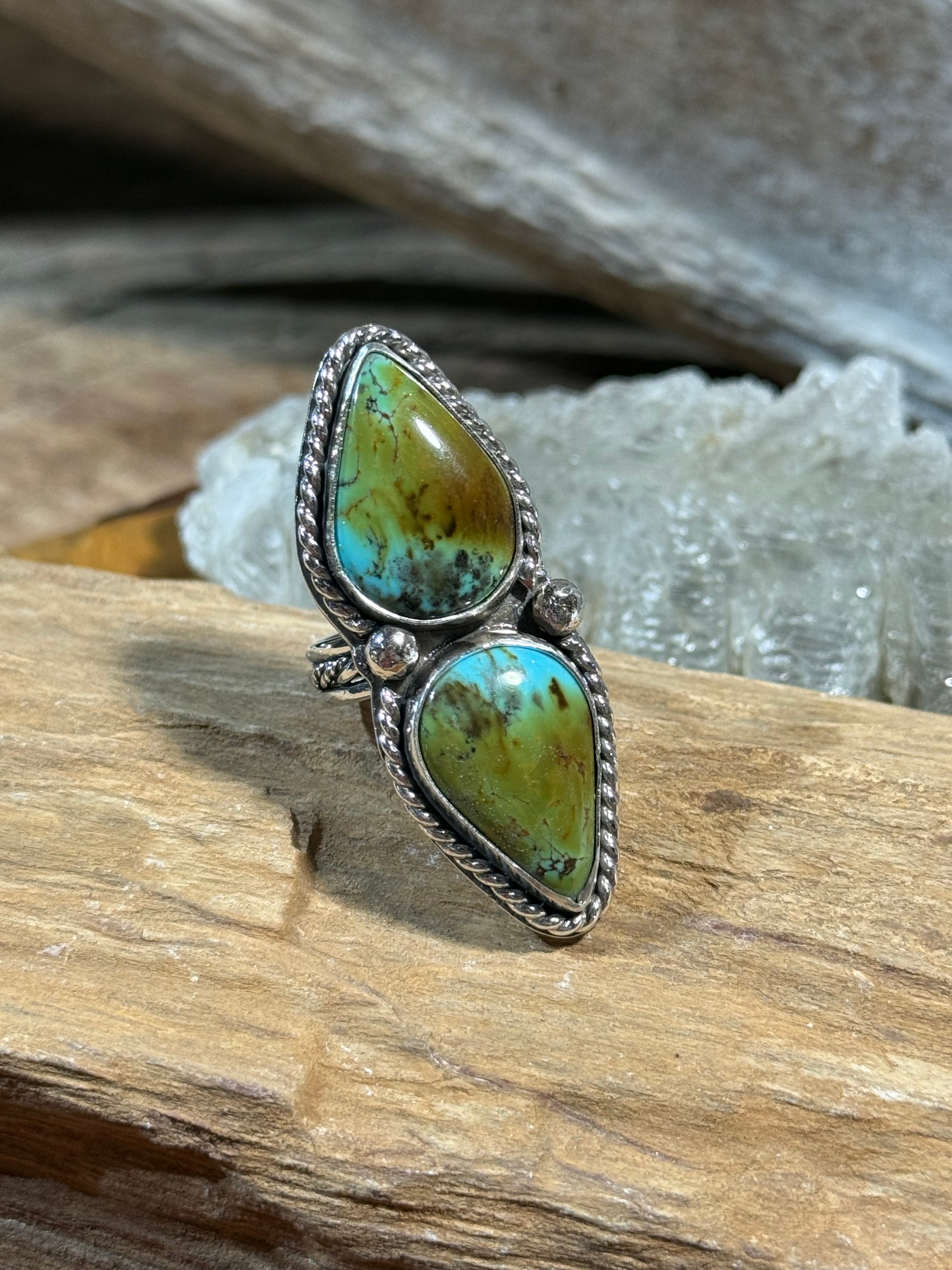 Royston statement ring, size 7. The bezel shifted just enough during soldering that I wasn’t happy with it after setting the stones. Also has a custom band.
