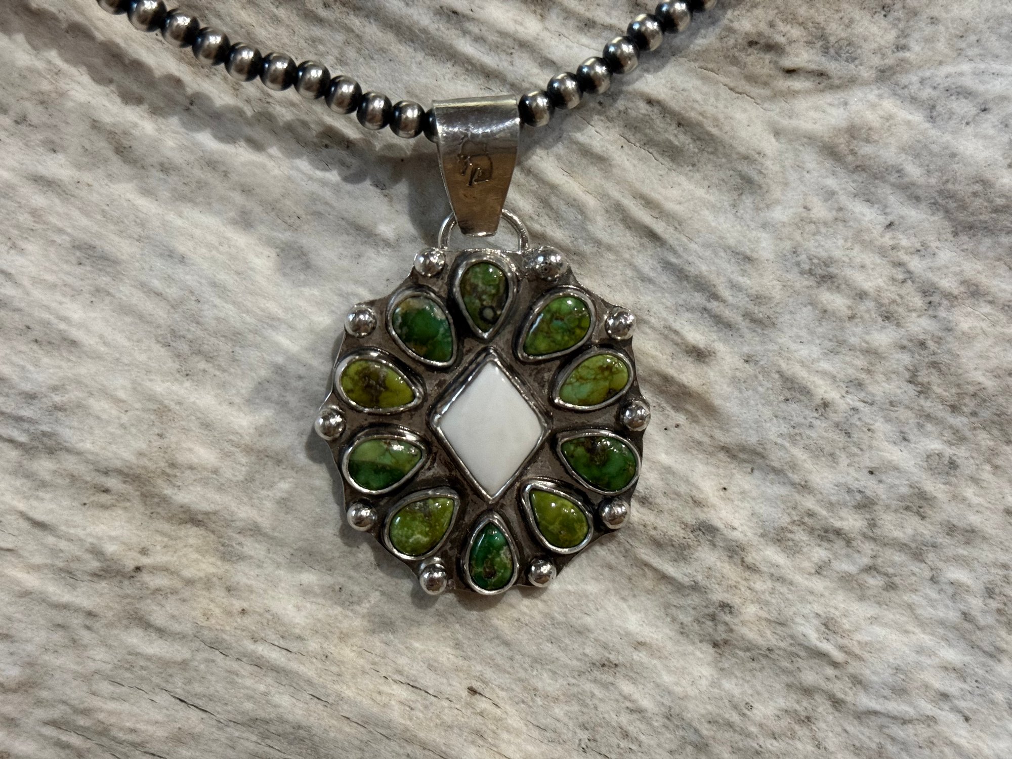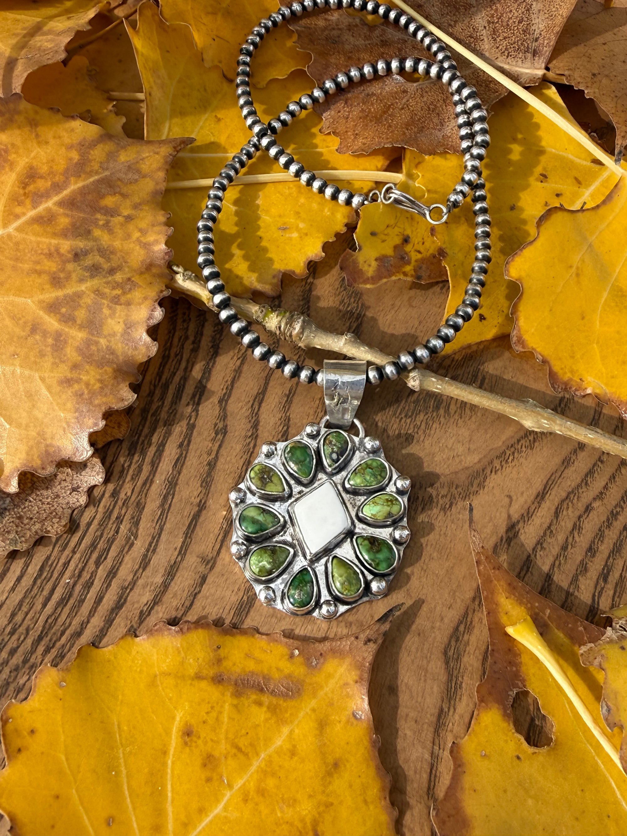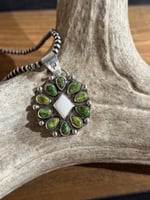 Pendant - Bold statement pendant with a crisp White Buffalo center stone surrounded by rich Sonoran Gold turquoise teardrops, all set in sterling silver. Also has the bucking horse stamped on the front and back of the bail of the pendant. Bail will fit 5mm silver pearl necklace. Both pieces are beautifully handcrafted and perfect for adding a classic Western touch to any outfit.