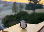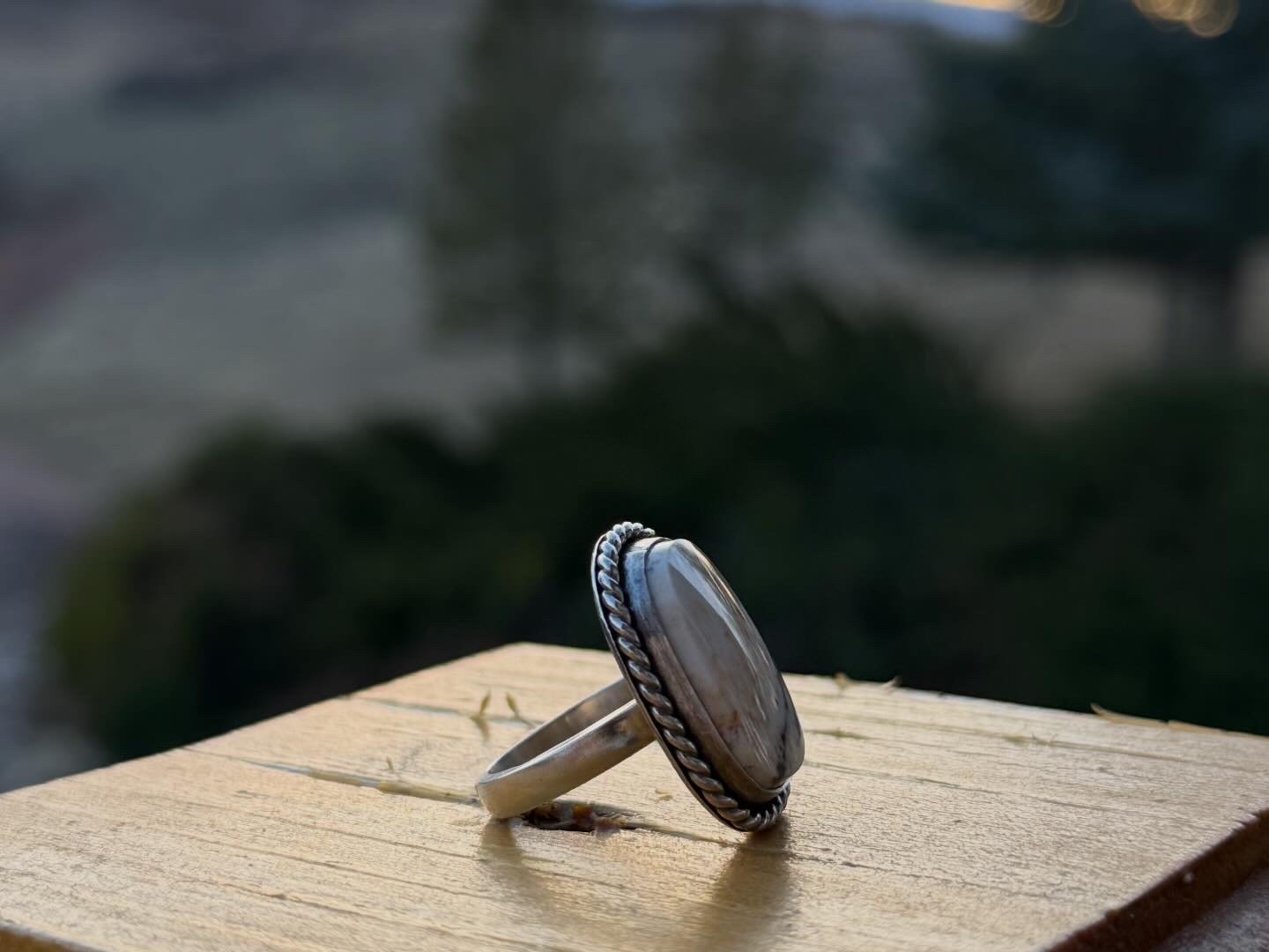 This statement ring features a genuine White Buffalo stone with natural matrix, set in sterling silver and finished with a twisted rope border for that classic Western feel. It’s got just the right mix of grit and elegance - easy to dress up or wear every day.